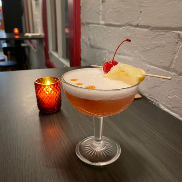 Poor Toms Gin, Liquore Strega, Campari, Lemon, Sugar, Egg White